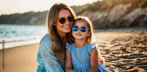 Smiling mother and daughter wear matching sunglasses and outfits, radiating happiness on a sandy beach at sunset