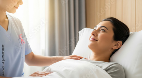 Smiling nurse comforting female patient in hospital bed, supportive and caring atmosphere, healthcare professional providing emotional support, warm light, hope and recovery