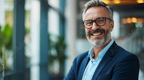 Smiling older bank manager or investor, happy middle aged business man boss ceo, confident mid adult professional businessman executive standing in office, mature entrepreneur headshot portrait