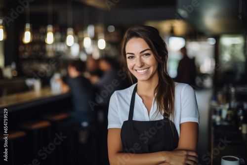 Smiling portrait of a happy female caucasian bartender working in a cafe or bar