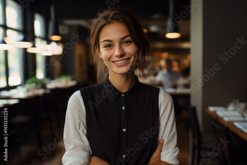 Smiling portrait of a young female Caucasian waiter in a cafe