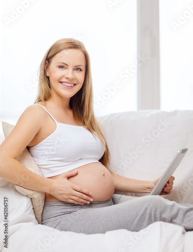 smiling pregnant woman with tablet pc computer