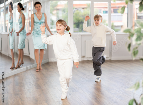 Smiling preteen girl practicing vigorous jitterbug moves with boy partner during dance lesson in choreography studio under guidance with female teacher..