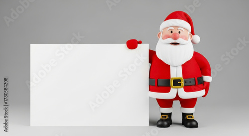 Smiling santa claus character standing next to a blank white sign for your christmas message