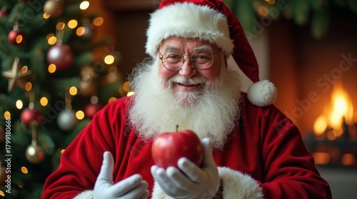 Smiling santa claus holding a red apple by a warm fireplace and christmas tree