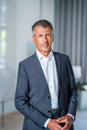 Smiling senior businessman wearing suit and standing in office
