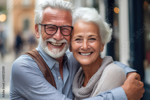 Smiling senior caucasian couple hugging. Generative AI.
