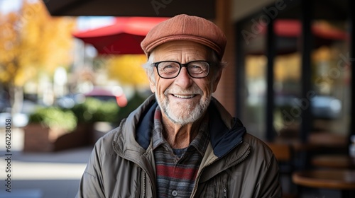 Smiling senior wearing a cap, with glasses, in autumn, coat, an elderly man with a joyful expression, wearing glasses, a cap, and a warm jacket, against the backdrop of a sunny, autumnal street.