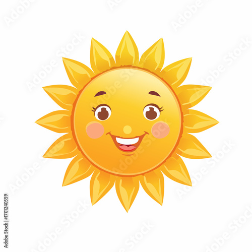 Smiling sun illustration, a cheerful and bright cartoon sun with a happy face and radiant rays
