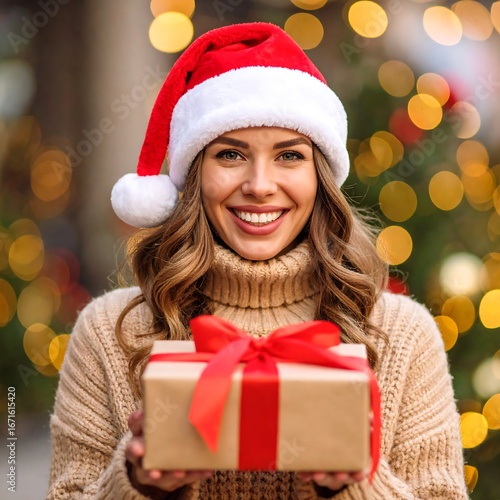 Smiling woman in Santa hat holds gift