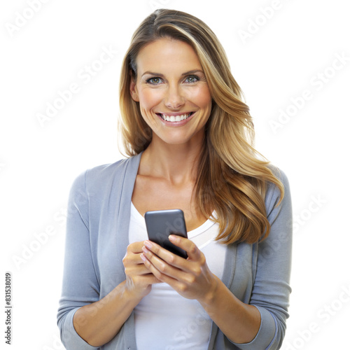 Smiling woman with blonde hair uses a smartphone while wearing casual attire