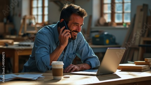 Smiling Woodworker on Phone While Using Laptop in Sunlit Workshop
