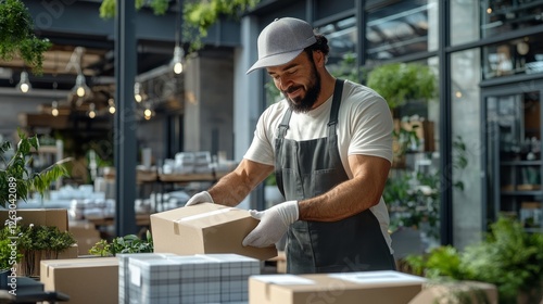 Smiling worker preparing packages in a modern warehouse filled with plants, showcasing dedication and attention to detail in an eco-friendly environment