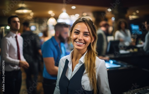 Smiling young and attractive saleswoman, cashier serving customers