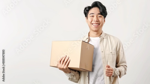 Smiling young Asian man joyfully holding a parcel box, isolated on white screen background