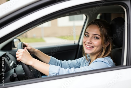 Smiling Young Caucasian Female Driver in a Modern Car, Showcasing Joyful Attitude and Confidence While Seated in the Driver's Seat on a Sunny Day