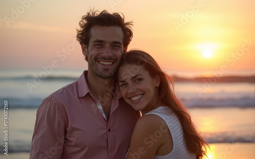 Smiling young couple two friends family man woman 20s in casual clothes hug girlfriend put head on boyfriend shoulder at sunrise over sea sand beach ocean outdoor seaside in summer day sunset evening.