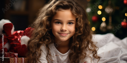 Smiling young girl with Christmas present, pajamas, and twinkling tree lights Generative AI
