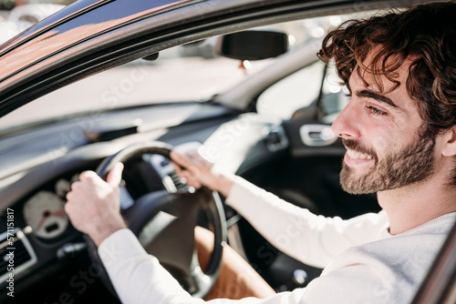 Smiling young man with beard sitting in car