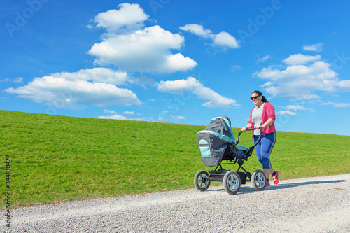 Smiling young mother pushing baby stroller. Green grass and blue sky with clouds background