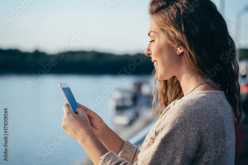 Smiling young woman looking in mobile phone