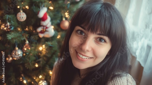 Smiling young woman with dark hair in cozy sweater taking selfies near decorated Christmas tree with warm lights indoors