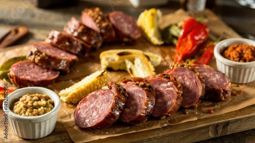 Smoked andouille sausage slices arranged on rustic wooden board with whole grain mustard, corn medallions and roasted red peppers, gourmet appetizer presentation