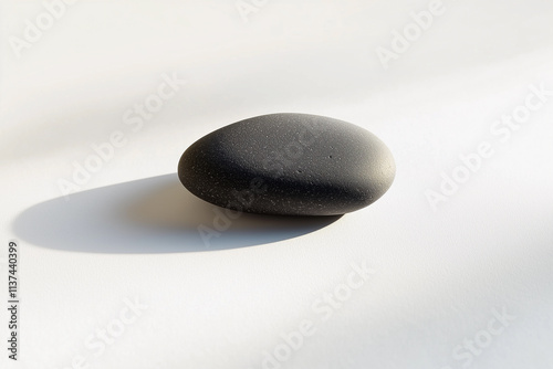 Smooth black stone on a minimalistic white surface with soft shadows