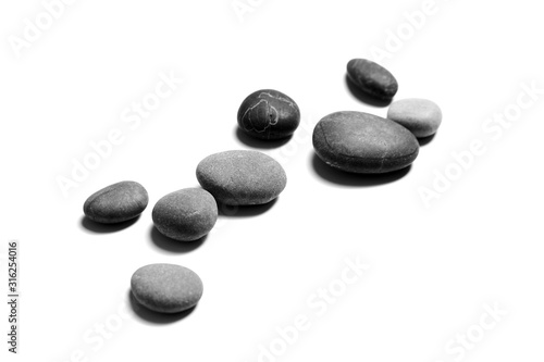 Smooth stones isolated on white background. Heap of gray and black sea pebbles. Spa objects