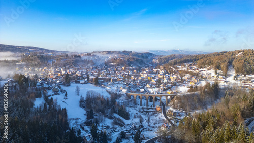 Snow blankets the landscape around the historic stone railway bridge in Smrzovka, Czechia. The charming village lies nestled in the serene winter scenery under a clear blue sky.