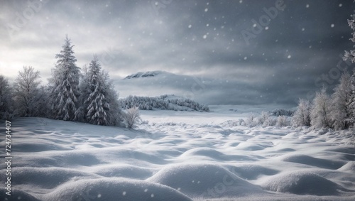 Snow blankets the mountainous winter landscape, where trees stand adorned in frost, under a blue sky with a captivating sunset, creating a serene and beautiful scene