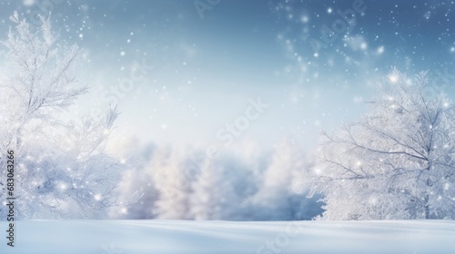 Snow covered fir twigs in front of a snow winter bokeh