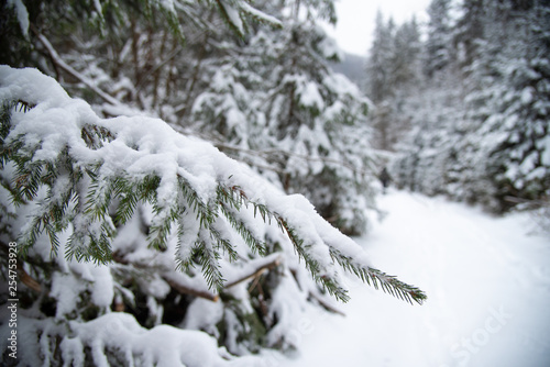 Snow covered trees in the winter forest