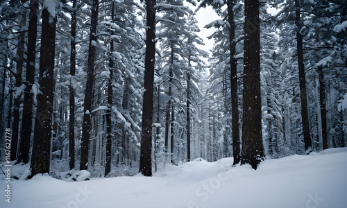 Snow falling in pine tree forest creating winter wonderland landscape