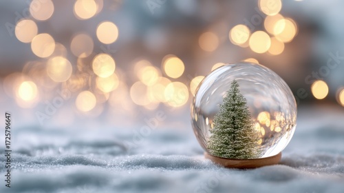 Snow globe with Christmas tree on snow with bokeh lights. Winter holiday decoration. Merry Christmas and Happy New Year concept.