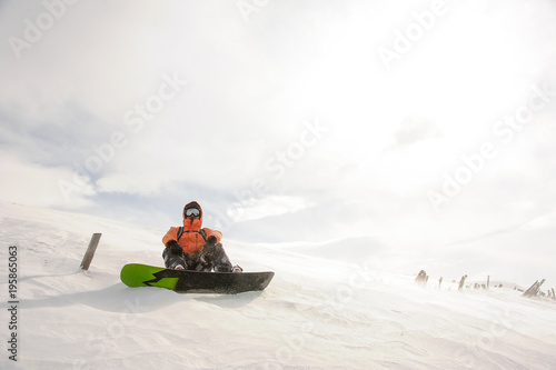 Snowboarder sitting on snow in Goderdzi, Georgia