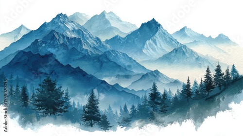 Snow-capped mountain peaks rise into a clear sky, surrounded by layers of forest undergrowth. The cool tones of blue evoke a sense of peace and tranquility, perfect for nature lovers.