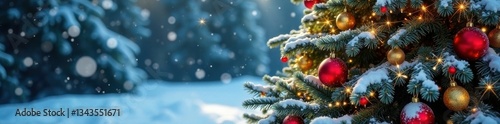 Snow-covered Christmas tree with ornaments and garlands, festive colors, frosty landscape
