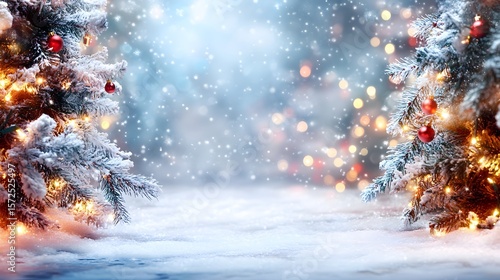 Snow-covered Christmas trees adorned with ornaments and soft glowing lights, adding cheerfulness to a serene and snowy backdrop