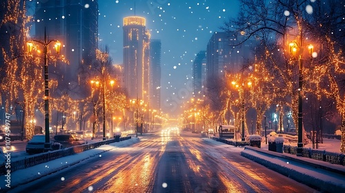 Snow-covered city street with Christmas lights and glowing buildings at night