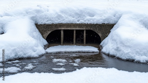 Snow-covered drainage tunnel at a winter landscape with flowing water underneath