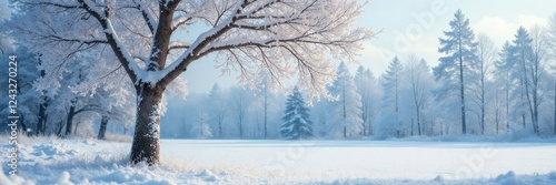 Snow-covered European white birch tree in frost, peaceful, frozen