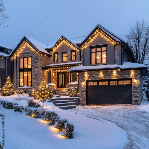 Snow-covered front yard with holiday lights in winter