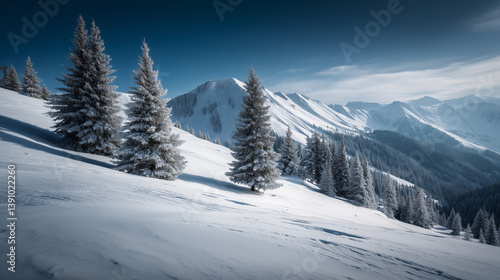 snow-covered mountain landscape under clear blue sky, untouched snow and visible pine trees, cold and peaceful winter atmosphere