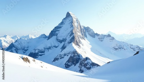 Snow-covered mountain peak, pristine white landscape, minimalist, wilderness