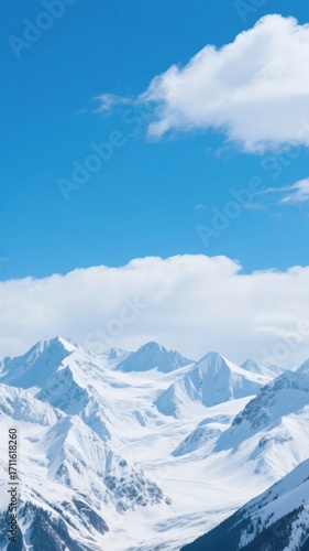 Snow-covered mountain peaks under a clear blue sky with scattered clouds