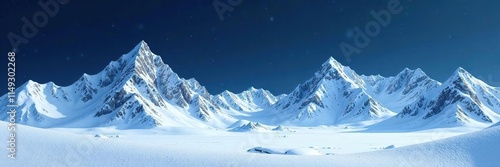 Snow-covered mountain range with glittering snowflakes and frosty peaks on a navy blue backdrop, icy terrain, snowy summits