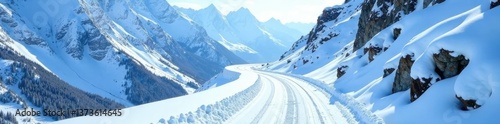 Snow-covered mountain road winding through a sea of white, winding, mountain road