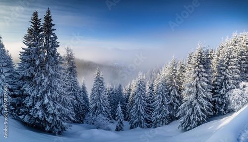Snow-covered trees with mist