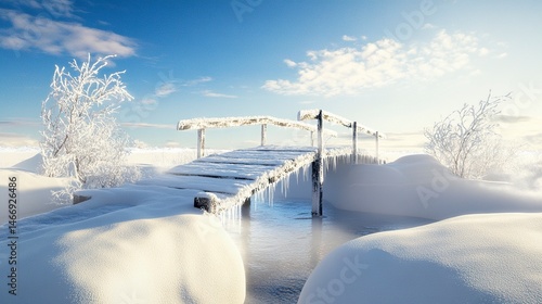 Snow-covered wooden bridge over a glistening, icy surface, surrounded by powdery snow and a bright, clear winter sky. Crisp and serene.